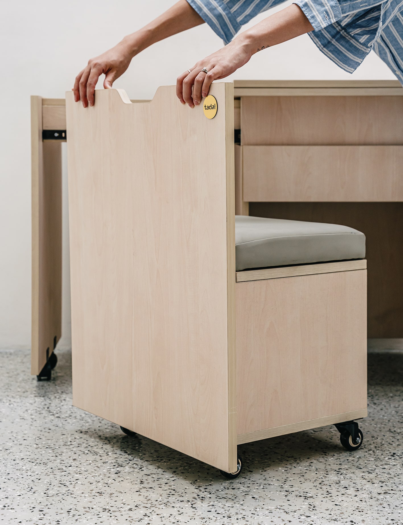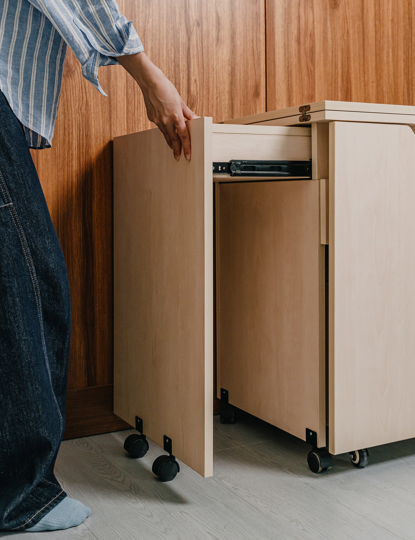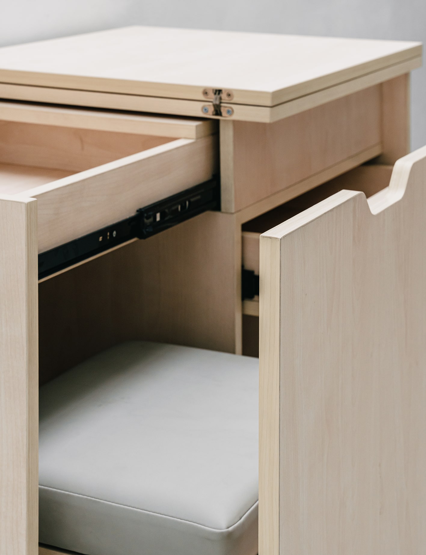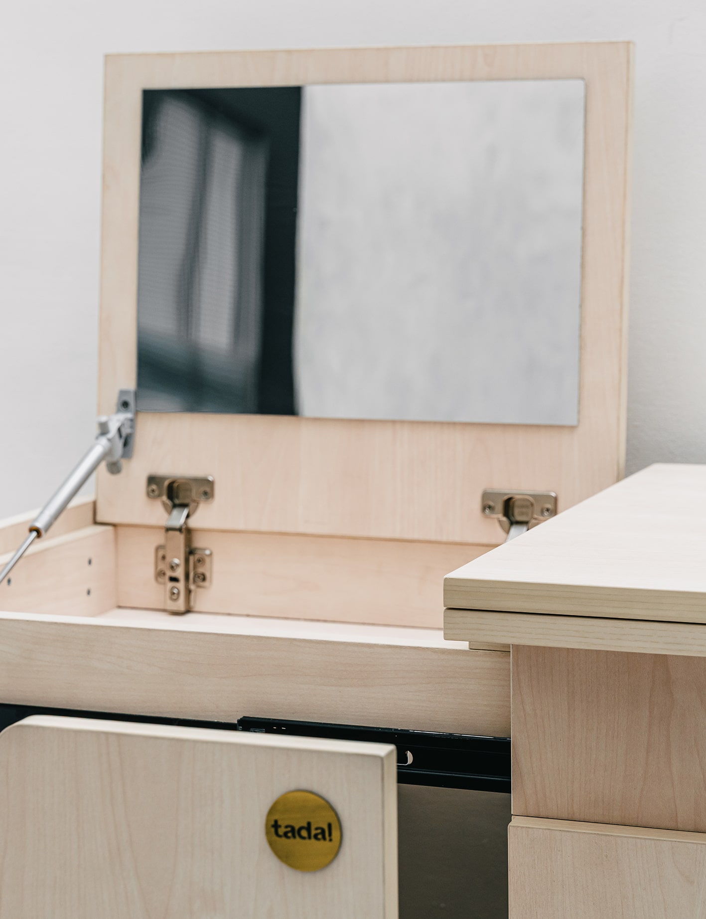 Introducing the GLAMSTATION – Discover your beauty oasis with our Glamstation. This is not just a working table; it's your makeup sanctuary. With a graceful open, it unveils drawers filled with makeup treasures, organized and ready for your creativity. And there's more – a built-in mirror for the finishing touch that transforms you. Embrace the allure of effortless elegance and organization.